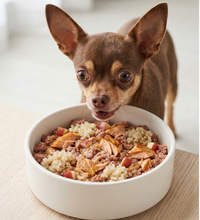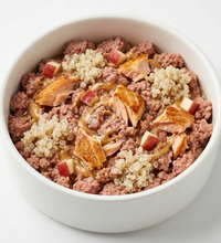 Your pup's new favorite meal just swam in. Our Omega Meal is made with real Atlantic salmon, quinoa, peanut butter, and apples for a nutrient-packed bowl that's as delicious as it is nutritious. Freshly cooked with no artificial ingredients, no grain, and no nonsense — just clean, high-protein food that follows AAFCO guidelines for all life stages. Serve it straight as a meal or use it as a topper to make kibble way more exciting. Either way, your dog is eating like royalty. Available as a subscription so the good stuff keeps coming.